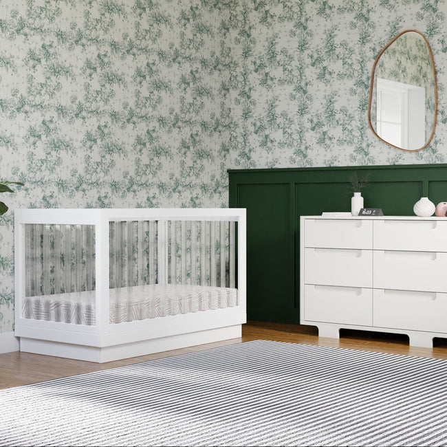 - MODERN CLEAR VIEW DESIGN: The chic Harlow crib offers you an unobstructed view of babe with unique acrylic slats on a contrasting solid pine wood platform.