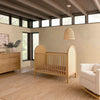 With its warm wood tone, playfully arched side panels, curved feet, and woven plant-based cane, the Bondi Cane Crib celebrates boho-inspired design and use of natural materials.